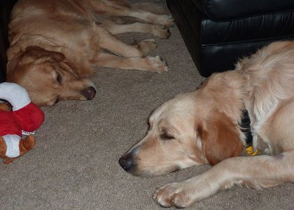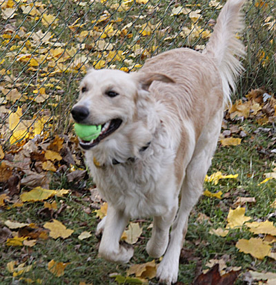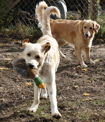 So far, my foster mom and dad say I am learning to walk better with the Gentle Leader – I’m not so keen on it, but it helps them, so I live with it. I really love racing around with Ginger in our back yard and trying to get whatever she has in her mouth. The best is a big Mallard. Check out the pictures and you’ll see who won the latest contest.