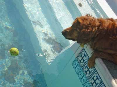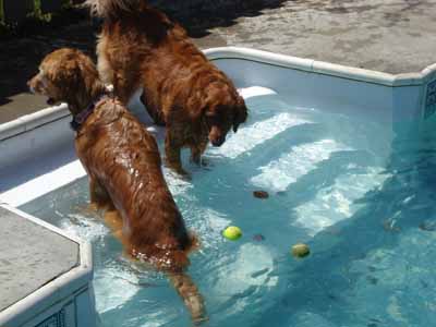 Sunday was so much fun! She got to experience what a swimming pool is! She was so excited when Penny went in the pool that she ran around the pool a couple times as fast as she could, turned and ran around it the other way. She learned to take the corners slow, so she would "rev it up" on the long stretches and then slow around the corners. It was so funny! She was pretty brave and went into the water up to her "knees," but not any further. If the ball went in and she could not reach, she would just look at us like, HELLO? could someone get the ball for me! She was a funny girl!