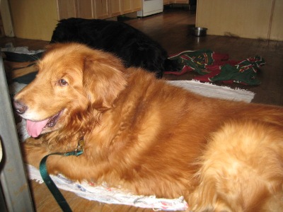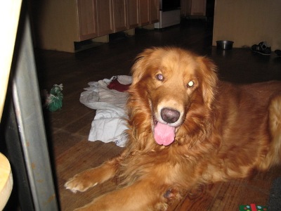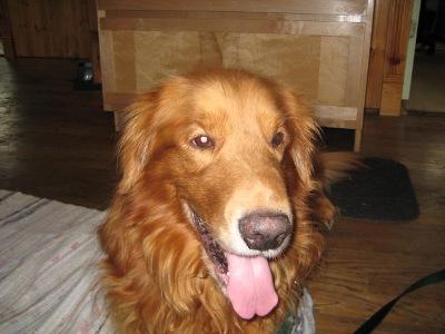 Bacon is a purebred Golden Retriever that is 8 years old and needs to be neutered. He is completely house trained and has never used a crate before. Bacon is UTD on his shots and does well around children. Bacon is supposedly chewing on his paws due to boredom (?) so he has a limp right now. He looooves people food but is fed a dry food with milk added. He was taken to the HS but they charged too much to euthanize him, thank goodness for us. He was surrendered because both children at his previous home are gone now and he could not be cared for.