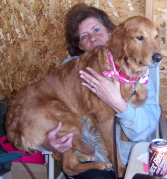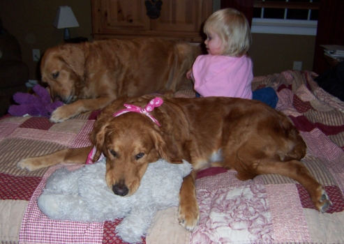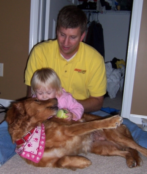 First off, shame on me for letting a month pass by without an update on Bailey!! Bailey came home with us after the RAGOM picnic. She got sick on the way home, but has been fine on the few car rides sheâs had since then. Bailey had her first heartworm treatment on September 29th and has been doing great. Itâs been hard to keep her quiet, because she gets SO excited when we come home, wake up or even pet her! She is just the sweetest little girl and she squeaks and squeaks when sheâs getting attention. Sheâs also very much a lap dog. She even climbed up into my lap while I was working on the computer one day! She also loves to snuggle in bed with us. Baileyâs a petite little thing and weighs around 58 pounds. She has the softest, silkiest coat Iâve ever felt! She does great with my dogs, cats and 2 year old daughter. The only bad thing I can say about Bailey is that she does the Golden nudge thing a bit too aggressively! Weâve just been ignoring her when she does that and she doesnât get any attention until she sits nicely. Bailey has pretty good manners and knows sit, down and stay for a short period of time. I really canât say how she does on walks, because she hasnât been able to go on one since sheâs been here. Bailey is housetrained, when we are here anyway. She will have accidents if we leave her out while we are gone though. Bailey is also one of those Goldens that needs to have something in her mouth at all times! She doesnât chew anything, just carries it around. It doesnât matter if itâs stuffed toys, shoes, socks or even towels!
