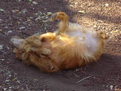 OK, so let's move on to the cute things. Scooder loves to roll around. I included a few pictures but it's just something you have to see for yourself. He gives lots of kisses. With certain people that he meets, he will give you his paw in a gentle manner. Loves all ages of humans. Mellow in the house, not a barker, gives kisses when you bathe him, is a Velcro dog, and all the other wonderful Golden traits. What I love the most is, when he looks at you with his goofy smile and gorgeous eyes, he has the look of a pup in an older dog. So far he appears to be housebroken, hasn't chewed on anything, and doesn't ask to get up on furniture. He is not protective over the dog food, great house manners. He does jump up in front of you but he never jumps ON you. Takes treats gently. I have learned all this in just 48 hours--imagine what you can learn in a lifetime.