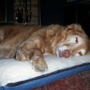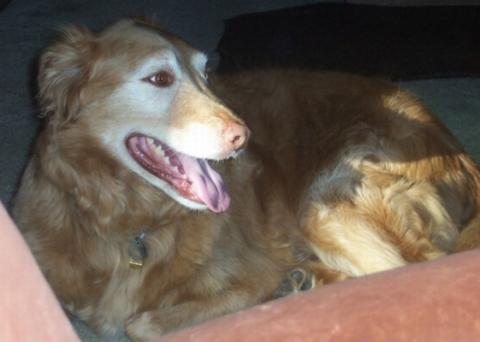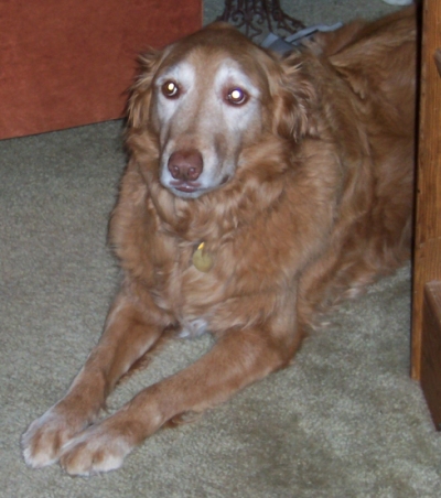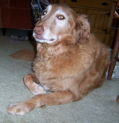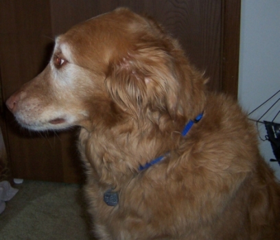 Bear has shown so far that he has all the Golden qualities. One of the strongest is his love of people. While weâre at home, he enjoys just sitting next to us, whatever we may be doing. Weâve been working with him on not begging for food while we eat meals. I thought it would take a length of time, but he learned within a matter of days. Now while I prepare meals in the kitchen or we eat meals or snacks around the house, Bear avoids food! Heâll sit in a different room or maybe in the same room but no longer shows interest. It was simple. That shows us that even though heâs nine he is capable of learning new things. Weâve also trained him to stay for lengths of time. He once tried to sneak after just minutes. Now, heâll wait on the rug comfortably to dry off when it is damp outside. Weâve left him alone for 5-6 hours and he has been just fine, so we are happy about that. We prefer he not be alone much longer than that if possible, since he has been all of his nine years. Bear is allowed free roam of the house but also likes to sit in his crate at times, so we crate him sometimes too. Weâve also had ducks outside when Bear goes out, and he just looks at them nonchalantly. He sits out in the yard, while the ducks eat below the bird feeders!