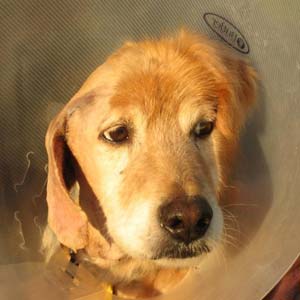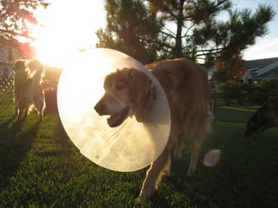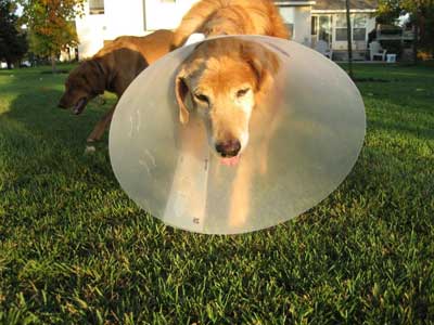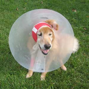 My wife picked up Bear from the vet this evening. He is in good spirits and doing well. He has a red bandage around his head and neck that is snug so he is snoring everytime he sleeps. He had a couple teeth pulled and his teeth cleaned while he was under. Right now he has a pain medication patch on to gradually release a strong dose of pain killers. He appears to be in good comfort.