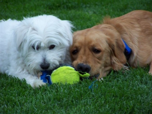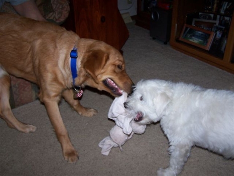 Thought you might enjoy this picture of Brady and Casper playing tug. He is adjusting to his new home, slow but sure. With each new person he meets, it takes him a little less time to warm up and trust. I think he is as happy with us as we are with him.