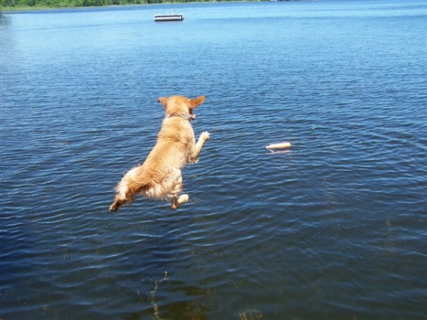 Brady definitely loves the water. Here is a picture taken this past weekend of him jumping off the dock.