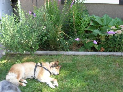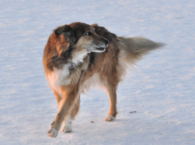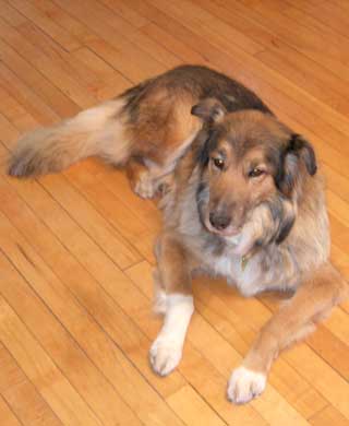 I also think she may be a bit older than the first estimated 6-7 years old, due to the shape of her teeth, grayness of her muzzle, activity level and slight eye cloudiness. My collie sniffed near her mouth (as he tends to be solicitous of other animals' health issues), and she gave him a warning growl. So she may be having mouth pain also.