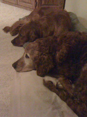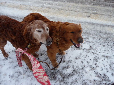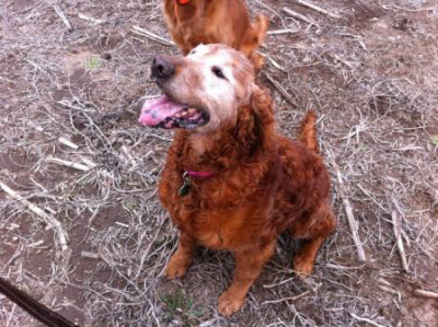 Let’s welcome RAGOM’s newest elder!  Breezer is an 8 year old that has a red, curly coat and a beautiful white face.  She came into RAGOM through no fault of her own.  Her previous owner could no longer care for her or Bella 11-087 due to some financial/health difficulties.  He loved these girls and he was all they knew.  Needless to say, this girl has been a little stressed trying to get accustomed to a new routine, another dog and two young children.