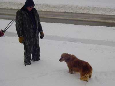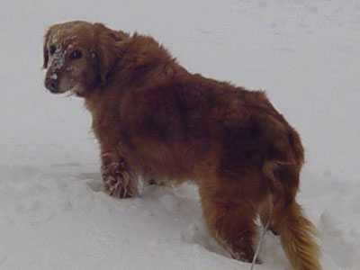 Just a note to let you know that not much has changed with Brooke. Seems her coughing may have increased a little but with a calming touch, she quiets down pretty quickly. She has days when she eats like a horse and then days (like today) when we cannot get her to eat no matter what we try. But, we keep offering it to her in hopes that she will change her mind. She will go to see the vet tomorrow and he will check her out. We will let you all know what he has to say. So, we have included some pictures of her in the snow. She loves to go out in it except when the temp is so cold that it makes her feet hurt. But even then she goes out and does her job and comes quickly back in the house. She got to meet her Foster sister Violet's (08-582) new family and told me later that she thinks we found the perfect match for her!!! She was very happy! Everyone stay warm and we will update again soon when we have some news!!