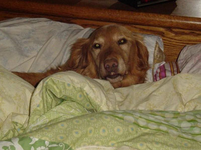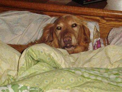 Before that we had another foster girl, Sandy 09-126, stay with us for a couple weeks till she found her permanent foster home. She was really nice but boy.....I have never seen a dog with so much fluffy fur!!! Mom spent alot of time brushing her to get her all pretty for her new forever home. Someone is going to be lucky to get her because she loves her people and loves attention. I got pushed out of the way a few times but that is OK since she didn't get much attention in her "pre-RAGOM" life. I knew that mom would make time for just me and she did. We would sneak up to the bedroom and she would let me get on the bed so we could snuggle!!! That was worth waiting for!!
