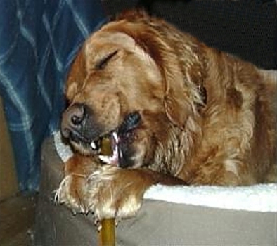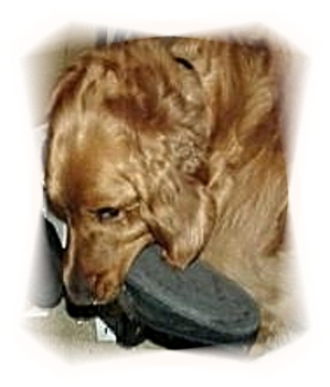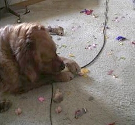When he came to us the word on him was "separation anxiety." I can't imagine why he might be anxious, having been left alone in a garage all day! He's a good example of what neglect can do to a wonderful, loving, big-hearted golden. All he did here the first two days was maim and kill all the toys in the house. Arms and legs strewn everywhere, it was a ghastly sight! But, never once did he chew on the other animals, me nor any of the furniture!