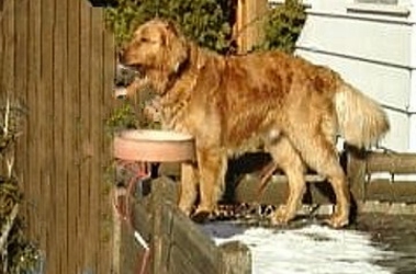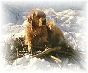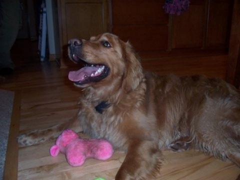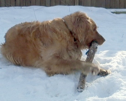Please don't even think of adopting this young guy if you have to leave him alone all day, or will not go out every day and play with this fun-loving "Moose." I found an old 10-pound cow bone in my freezer (what? So, what do you keep in your freezer?) my own golden didn't want. Moose just loves it. It's just his size and it satisfies his need to shred woobies. I keep a few hundred custom-built sticks in my yard and they seem to be his favorite. He can spend hours outside sitting in the snow just merrily shredding them.