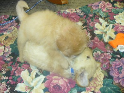 Here is Mr. Burke,(pic: on the bottom, being pinned by little sister Paris), he is growing well, and had a good first check up along with the rest of his siblings. Burke is happy and playful, and now weighs 6 lbs.. He received his second dose of sarcoptic mange medication and some de-wormer at his vet appt..