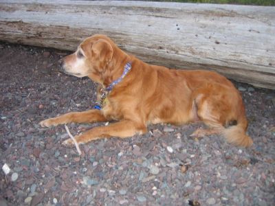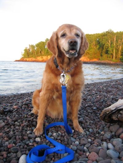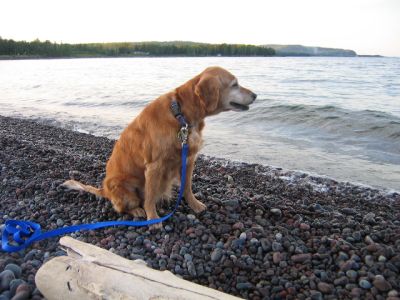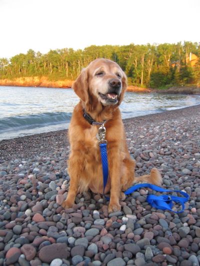 I wanted to drop you a line and let you know how I'm doing. I turned 12 years old earlier this month. I'm on vacation right now with my family on Lake Superior. I love walks on the beach and playing in the big lake. Healthwise I'm doing well. I'm still getting allergy shots. This time of year I still itch and scratch a lot. But my family is trying real hard to keep me comfortable. The food is good here, I've been eating well and pooping just as good. I still wake my dad up at 5:30 am to go potty but not every morning. Say hello to Red, Skylar and Molly for me. I hope I can come and visit you sometime this summer. Maybe on a really hot day so we can have a pool party. Well on with the photos....these were taken this weekend at the lake. --Carly