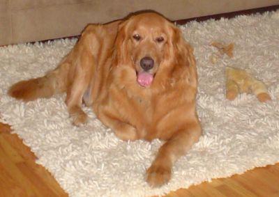 8/27/06: Casey (with a long A- like Casey Jones) arrived this afternoon. My very first impression of her is that she is sooooo mellow- I already nicknamed her mellow yellow. She's a medium colored purebred Golden with thick soft fur. She should be groomed to get some of the mats and excess hair off her, however, even with her mats she is a beauty. She's carrying a few more pounds than she should for her frame so we are going to put her on a diet. It is especially critical that she maintains an appropriate weight as she has been diagnosed with Lymes Disease. In case you don't know, Lymes Disease is hard on a dogs back end so any addition weight will make getting up from a laying position more difficult for her. She's not yet spayed but I'll be making an appointment for her sometime this week. She also has ear infections and I'm going to ask the Doc to clean out her ears when she is under for her surgery.