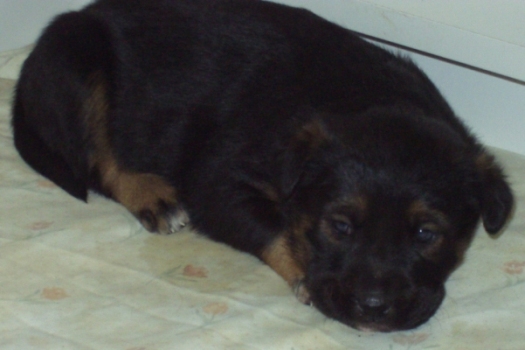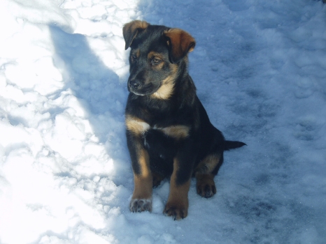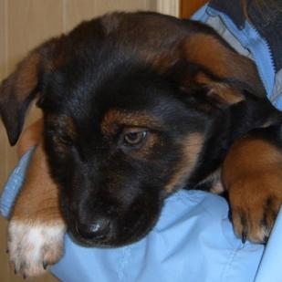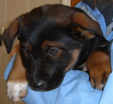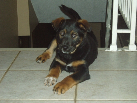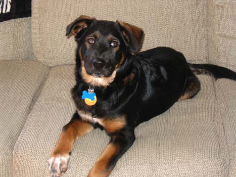 Chandler - now Sherman is doing great! He is 2 weeks into puppy school, and the star of the class. Our instructor always uses him to demonstrate new practices because we have worked with him so much. He has even learned some of my old German commands from shutzhund; sitz-sit (that's an easy one), platz-down, and fuss-heal. He loves to train and we walk him on a state trail here in Forest Lake that he really likes. He is hovering around 40 lbs., give or take, and the vet says his size is perfect. My dad just needed emergency surgery to remove 8" of intestine, and we brought Sherman over to cheer him up and since he knows the command "touch", we just put him in a sit-stay on my dad's left and he touched him on his knee and sat there for quite awhile. I know it perked my dad up and Sherman didn't mind the attention...he never does!
