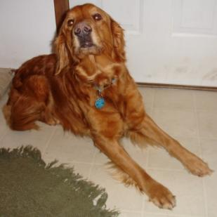 4/13/06: Welcome "Chica Belle of Holly" (full AKC name) to the Twin Cities! Chica came from Northern MN this week with her brothers Merlin and Willy also featured on this page. She is 6 years old and a beautiful red, weighing in at 54 pounds. She's a petite little girl who is as shy yet friendly as can be. She was trained as a hunter and is great with all whistle and verbal commands. She also loves to ride in the car. The daughter said she hunted in Iowa so she is used to long car rides. The man who surrendered these sweeties had to be placed in a nursing home and all of the dogs were treated kindly and with great care. Chica did have a litter of 10 puppies last June and now she will be getting spayed on Friday 4-15-06. She comes with AKC papers and all of her vaccs up to date. She is one of the most laid back dogs I have encountered. She would be great with young children for a family looking for a gentle spirit. So far she even is ignoring the house cat! She loves to snuggle but will go find a cool place to lie down too, unlike most Goldens I know who are always at your feet needing love. Hurry up and express interest in this girl, she will go fast!
