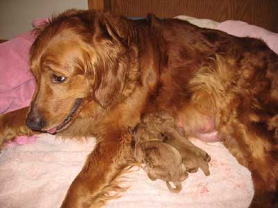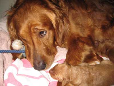 Nicely is an excellent mother. We knew she would be, she is so sweet and loving. The first two days she was very protective of her puppies and had to be coaxed outside to go potty. Now she is much more relaxed and leaves her puppies for short periods of time. She allows us to handle them as much as we want. She is so easy-going.