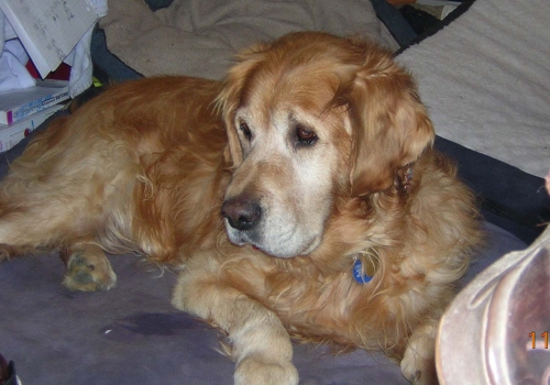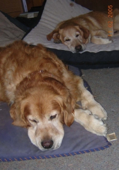 7/29/05: Chubby has been at my house for 5 days now and is a perfect house dog. He occasionally picks up things and carries them around (socks, slippers, plastic bottles), but with the addition of stuffed toys he shifts his interest to more appropriate items. He has never chewed anything up (OK, he chews on the empty plastic bottles). He gets along fine with my cats and dogs. If the play gets too rough or lengthy he will let the others know and they back off. He likes to go for car rides and gets into the car OK, but sometimes needs a little support getting down due to his arthritis (see below).