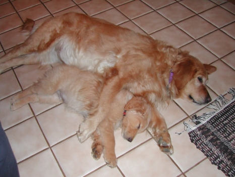 Baby Clancy at home now with his forever family. Sully is the former RAGOM dog Miss Piggy (http://www.ragom.org/dogs.cgi?number=05-263). Clancy now has a new name, Murphy.
