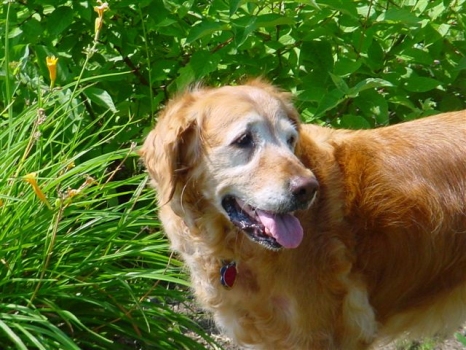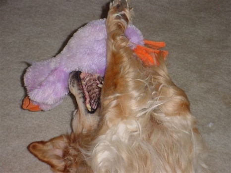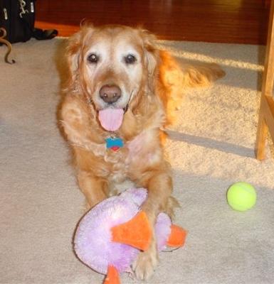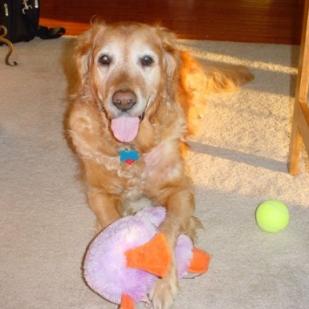 It's me, Cleo. I've just been hanging out in foster care, playing with my dead duck and going on occasional home visits with Foster Aunt. Foster Mom says I am the perfect house guest because I have no bad habits. I'm not even afraid of thunderstorms or fireworks. (Have there been any?) And I am an excellent ambassador for RAGOM at events. I just love everyone and everything. Foster Mom says I have a zest for life. I have more energy than the two resident dogs here put together...except when I eat. That's when I like to take things nice and sloooowwww. I like to spit mouthfuls of food onto the floor and eat each piece individually while I savor every bite. I can't be sure, but that could be the reason Foster Mom set her alarm clock for ten minutes earlier. You see, she has to stand guard over me while I eat because the resident cow...I mean, dog, horns in. When I'm all done I RUN for my duck and I shake him all over the room! Don't tell anyone, but when Foster Mom gets home from work we play the tennis ball game in the backyard. That's where Foster Mom throws the tennis ball, I run for it, and then we play keep away. I'm not supposed to do that cuz it's high impact on my joints but Foster Mom says that since I'm taking aspirin now I should be okay. And I have been!! After play time I put my head in Foster Mom's lap for scratches and pets. Then comes bedtime and we all play a game I made up. I like to wait until Foster Mom and the two resident dogs start up the steps and when they get half way up, I come racing through and blow by 'em all!! I'm sacked out in my dog bed before they even reach the top!