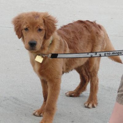 This special boy is about 4 months old and weighs in at a hefty 37 pounds. He looks Golden for the most part, but it wouldn’t surprise me to find out he had a little extra something in there for spice. The toes on three of his feet are white and he has a white blaze on his chest. His back legs are very awkward, with knock-knees and feet splayed out to the sides. The vet checked him over and didn’t find any specific orthopedic issues, but we’ll be keeping a careful eye on him. He is up-to-date on his vaccinations and scheduled for his neuter next Tuesday.