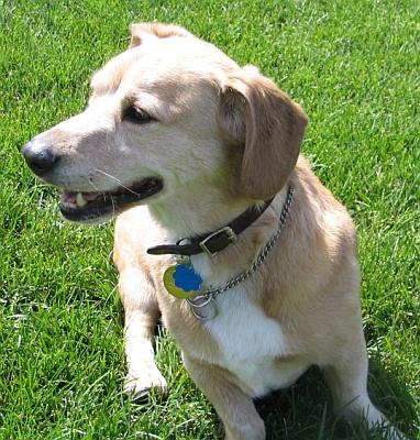 5/21/05: Hi, this is my sister Abby and me. I am the one with the short stubby legs. But please don't under-estimate my running ability. Abby is my best friend and I do everything with her. I eat and drink the same time that she does, lay close to her (she uses my back as a head rest), and play catch with her. We both run for it but I make her carry it back!