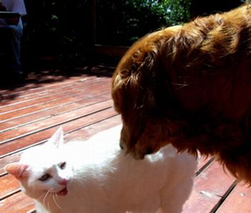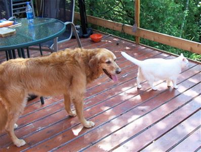 Here are some pictures of me & Bijou, the white cat. We are very good friends. She likes to talk to me and I think I'm finally learning to speak cat.