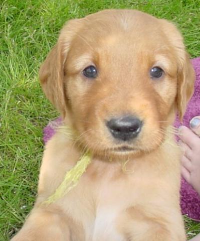 5/10/06: Ella is now 6 weeks old. She is so very sweet and calm. She has gained some weight so she is not the skinniest anymore. Still small next to her big brothers Rollie and Touzer, but she holds her own. She is one of two girls that look just like their mom. Dark red face with a small spot of white on the top of her head and a white patch on her chest.