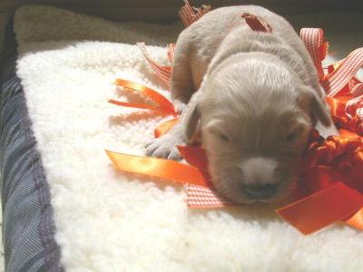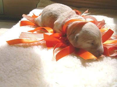 Dahlila (girl pup), ninth to be born of 11 pups.  She made her way into this world at the emergency clinic in Apple Valley.  Dahlila was born on 4/29 at 1:40 in the morning.  Dahlila will always have a Orange collar on when we take pictures.