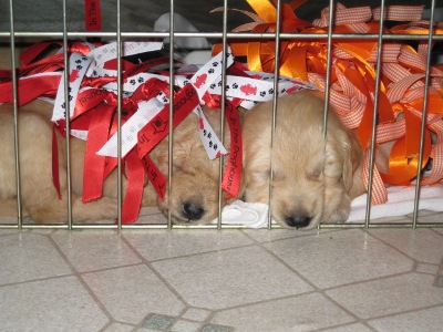 Shanna pups are doing great – I just have one picture of where they all go when we have to bring Shanna out – as you can see this won’t last much longer – they are already out growing one basket!  Everyone weighs over 1 pound now which is great news.  Now we just have to keep things going in the right direction.