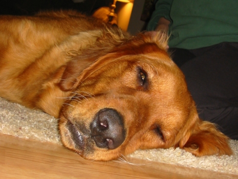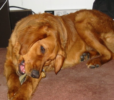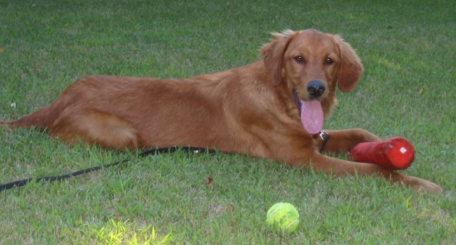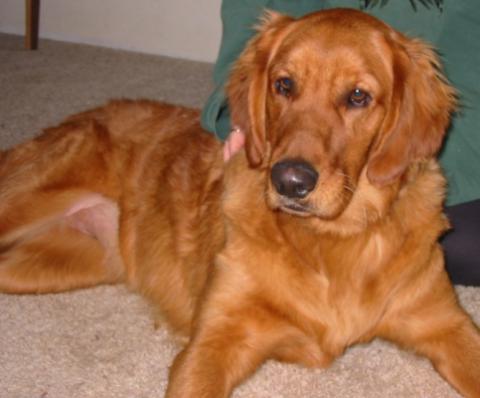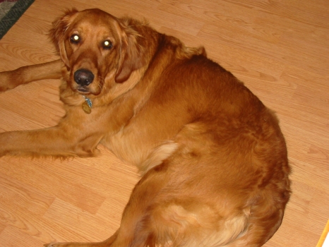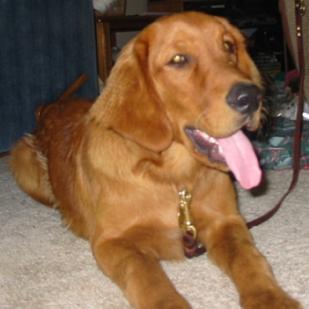 What can I say about Dakota? He is doing great! He still thinks he can be a lap dog, though!! And likes to snuggle in bed with us. He enjoys playing with the resident dog and Sophie 05-298 if she lets him :) He walks around the house with a stuffed animal in his mouth, then goes up to the dogs or humans to see if they will play tuggy with him. We continue to work on basic commands, sit and come. Dakota would greatly benefit from obedience training!