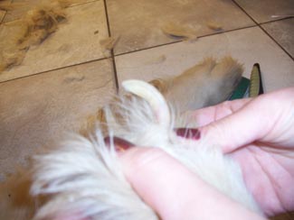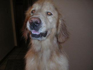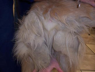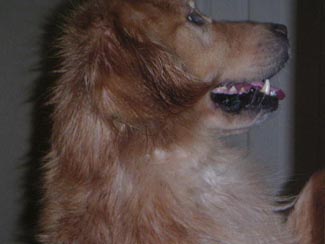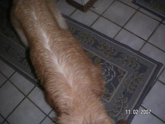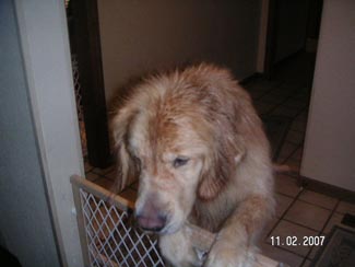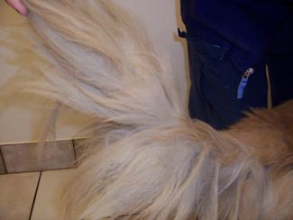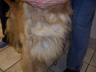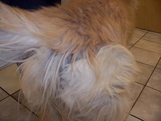The pictures will not show you how thin he really is. He weighs 55 lbs and should weigh between 70 and 75 lbs!! He has a sore on his left rear leg, his eyelids are inflamed, and his temperature is 104 (101 is normal). The mats were HUGE. Dr. Jennifer did the trimming and shaving herself. She saved just a small sampling of what was on Bushido's back side, under his tail and his feathering. The mats were so bad they kept all the yucky stuff sticking to his skin and his poor bum was bright red when they went to take his temperature. His nails were almost 3/4" long and his pads worn funny from not being able to walk correctly. I can't imagine the pain this boy was in. Yet from the time I met him, through his trimming and bathing, his tail never stopped wagging. He is sweet and handsome and can't hardly hold still as it is ALL a new world for him. I'm so grateful my friend at the Humane Society gave the pet hospital my name and number. Thanks, Vicki.
