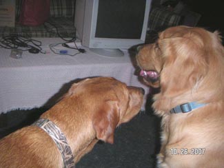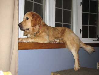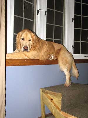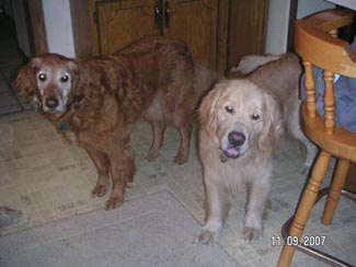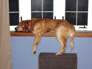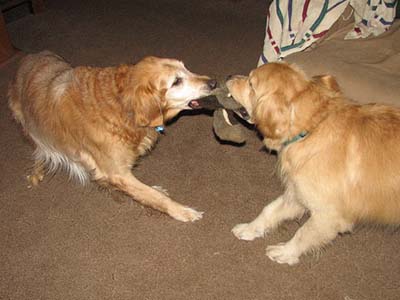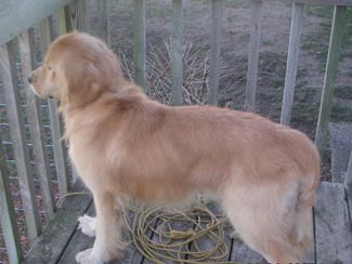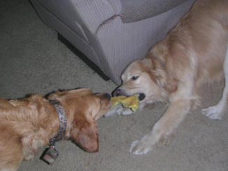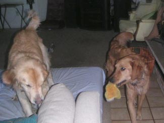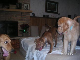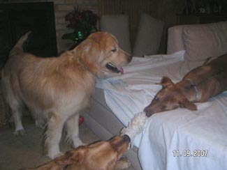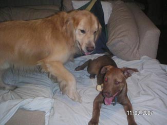 He almost seems housebroken as we have had no accidents thus far. He has not marked anywhere and I took him on a tour of the house. Am guessing maybe they let him out of the garage to potty and that was it. From now on he will be free to go outside to potty, but also to feel the breeze in his coat, smell the smells of the yard, play ball, play with Ranger, go for walks, explore the field and sun himself on the deck. Inside while we are home he will be part of the family and lay on the couch and cuddle, chew bones, chase the ball, figure out what all these new sounds and 'things' are and learn about being loved.