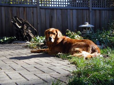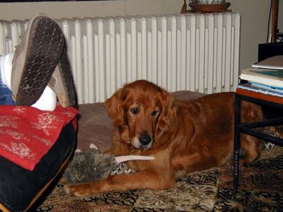 The first picture is of him with his squeaky possum..he carries it everywhere. The second picture is the classic regal golden pose in the backyard this weekend while we were raking.  (Feel free to post these in his dog-blog if you want).