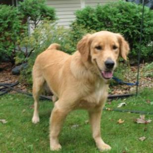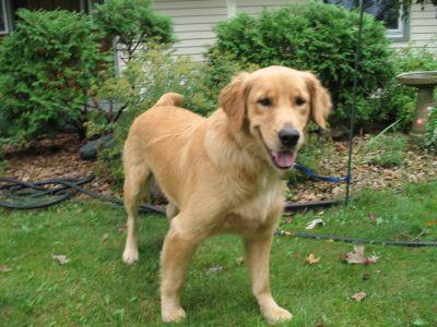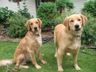 Diesel had a trip to the vet today, and got a clean bill of health...except he could stand to lose a few pounds. He's a stocky, solidly-built boy at 85 lbs. - just look at him in comparison to our 60 lb female Golden. After the vet visit, my girls ran into Target for a few things and Diesel and I waited in the car. He couldn't figure out what he was supposed to do with himself in the van, had his hind end on the back seat, his front quarters between the middle seats (but he's too broad to fit), and finally fell asleep like that, back half sitting, front half standing, with his head draped over the armrest! He looked so funny. But he's steadily getting more comfortable with all the new things we're asking him to do, even jumped in the van without prompting at our last stop. He's a very smart guy and a quick learner.