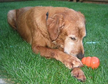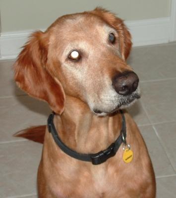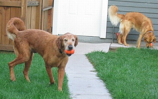 When he fist arrived Monday, it took very little time for Duke to make himself right at home. He met his foster brother (our Golden, Willie) and got acquainted with his new surroundings. He found the dog toys and picked out several to play with - he loves Kongs and balls. Duke doesn't interact a whole lot with our Golden, which seems to work for both of them. However, the two rest on the back steps next to each other and also stick pretty close to one another when lounging around in the house. We've taken several walks and even went for a short run. Duke does very well on a leash. He is able to heel without the use of Gentle Leader or training collar. Although when we took him to the vet we did use a Gentle Leader because he pulled a bit. Duke really enjoys going for walks and runs. He likes to make a few stops here and there and take in all the smells.