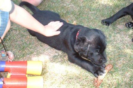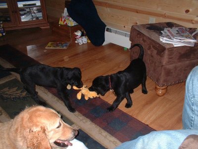 Darwin is turning out to be a whirl wind. This guy has more energy. He will go at a full run and grab anything in his way. He will stop turn around and do the same thing, he is so much fun to watch. Amazingly these guys have not messed (pooped) in the whelping box they have been in. It is 4x6 and they will go all night without any surprises. I come home for lunch and same thing.... nothing. They urinate of course, but I think these guys are going to be easy to house break. I did find out that MOM was purebred Golden and DAD was purebred Lab. I will keep you updated on this handsome guy.