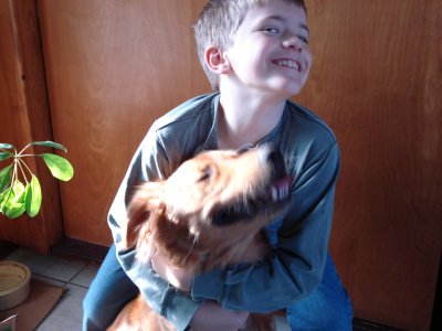 EJ had a visit to the vet today. He has been up-dated with all of his vaccines, dewormed, micro-chipped and checked for heartworm (negative). EJ does have allergy ears and received a bottle of drops to help him. My vet figures he either has seasonal allergies, or food allergies. He is on a much better grade of food than what he came in with. I personally have had good results with Solid Gold and Eagle Pac with my Holly. EJ was a very good boy at the vet. EJ weighs 76#. EJ sat like a gentleman (without a gentle leader!). My vet has 5 "clinic" cats and EJ was very interested in them. He got down in puppy stance, his front paws and head low, with his butt up in the air and wanted to play. Of course, the cats didn't and when they batted him, he backed off and barked at them (the first I've heard him bark). He has ignored my cats, but then my cats are a bit scarce since he's come to visit. I guess I'd make sure he is supervised at first until he's used to a furry friend. EJ also made strides in being friendly with the two other dogs visiting the vet clinic. When EJ first came he was terribly timid with other dogs. He initiated contact and was very friendly with them. EJ rode in the car very well. He simply laid down in the back seat and didn't even streak a window! The jumping is getting better. We are consistently using the "off" command. He did knock over Carma the other day outside. He was being pretty rambunctious. EJ is a good boy. I really like him.