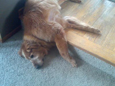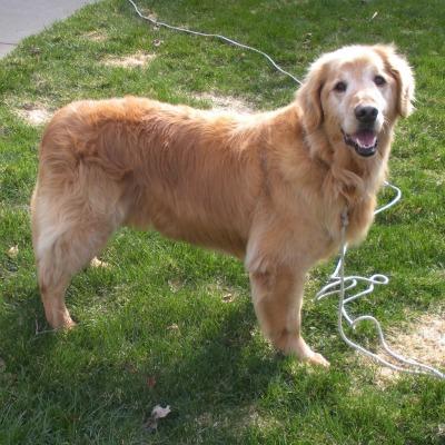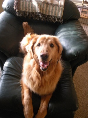 We’ve only had Ellie a few days, so are still getting to know this wonderful girl!  She is, however, one of the happiest golden retrievers that I have ever had the pleasure to meet!  Her tail is always wagging, she appears to have a smile on her face most of the time, and she literally prances when you call her name!  She lived primarily outside in the past, and is adapting well to the inside life. She’s had no accidents in the house, is completely comfortable with stairs and wood floors, and has already learned how to get comfortable on couches, chairs, and the various dogs beds spread throughout the house. We are crating her at night for the time being, and though she isn’t wild about going into her crate, she doesn’t make a peep once in there.  In terms of walking, she is tolerating a gentle lead very well, but actually walks on a normal flat leash with only minor pulling.  She already gets very excited and wiggles from top to bottom when she sees her leash come out for her daily walks!