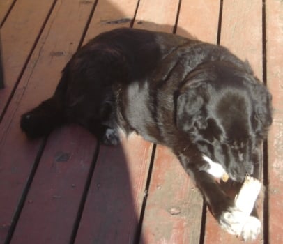 Emma's mom was a vegetarian so she didn't have bones or rawhides, but at my house she is allowed to have both. Emma loves to gather her rawhides and make a pile next to my bed. This is her spot and if I'm looking for her this is where she will be. Emma will growl at other dogs when she has a rawhide, she won't bite or hurt them but she wants them to respect that it's her rawhide and to give her room. My Golden gang just doesn't catch on to her hints and they love to tease her about rawhides. My Oakley knows that Emma is next to my bed with a rawhide and he will keep walking by the bed to irritate her, then he runs in and out of the room to get her really going. You have to understand that if Oakley was human he would be the little boy who pulls hair to get the girls' attention. Emma can and has been in the same room as my Golden goofs with a rawhide and if they leave her alone she is fine. I can go up to Emma and take the rawhide away. When my cats walk past Emma when she's enjoying her rawhide she doesn't care. It's the pesky Golden boys who have to tease and torment her, that get her going. When Emma is growling at them she can be loud and sound kind of scary but she isn't. Ok, so Emma has one bad habit. In a home without other dogs you wouldn't even know she has an issue.
