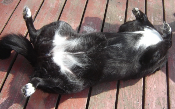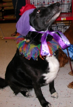 Ok, it's time for foster mom to talk?you have to cut off Emma otherwise she would talk your ear off?just kidding. She is a true sweetheart who is about 9 years old, medium sized, black with white on her paws, chest, and tummy. She kind of looks like a Border Collie with medium length hair. I believe her mix would be described as a Spaniel/Black Lab/Border Collie mix. The only reason I say Border Collie is because the white markings remind me of a BC, so don't worry, she's doesn't have a herding drive. Unless, if herding means she enjoys a lot of belly rubs... :)