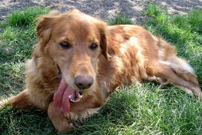 Emmie spent a few hours on Saturday at the RAGOM picnic. Emmie was there for about 3 hours, tons of Goldens everywhere! When she arrived, she walked through all of the people and dogs with no notice. She is very good on a leash and tends to ignore other animals, except squirrels. I took her down to the lower pavilion for the foster showcase, where there were probably 15 dogs playing the doggie games, and another 30 or 40 in the pavilion, with probably 50 people milling around. Emmie didn't pay any attention to any of the dogs, didn't appear to be interested at all. She happily sat for pets from adults and children, and I allowed a couple of older kids to give her treats, telling the kids to tell her "be nice" before they gave her the treat. She took the treats nicely from everyone.