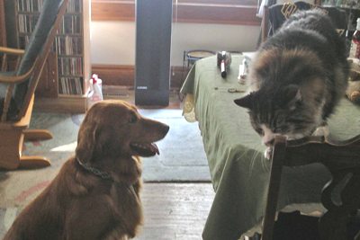 Since she has been back with us, (we fostered her the first time) she has been a very good houseguest. She has deferred to our resident dogs. She is VERY attentive to our 18 lbs. resident Maine Coon Cat, Fatboy, and our two birds. In Emmie’s defense, Fatboy, who never comes around when we have foster dogs, has been tormenting her by wandering around and meowing at her. Still, I would not recommend a household with small animals or birds, as she is FAR too interested in both.