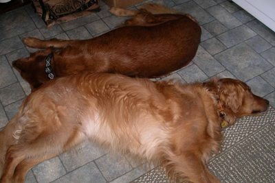 As you can see later in the day the dogs were all bagged out. Wyatt, one of our resident dogs and Emmie are sleeping blissfully away. Emmie is doing really well, improving every day.