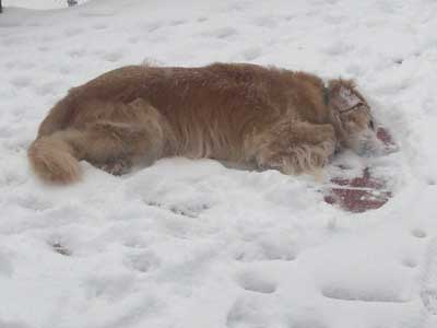 I am going to attach some new pictures. One of my best friends here is Sugar kitty. She has really long hair just like me and she loves to sleep with me on my dog bed. I like her. I also love to roll in the snow, and one morning I'd just rolled and my fosterdad took my picture. He said I looked like Sasquatch. I don't know who that is, but I like that name! Sasquatch!!!