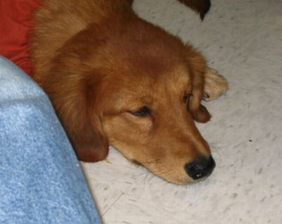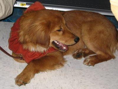 Ernie will be at PetCo on Sunday. Another vet saw Ernie this week and is guessing his age closer to 2 or 3. He has a full set of teeth with a little tartar on the back molars, so it's believed he is older than we originally thought. He wants to play like a puppy, so hard to tell. She also mentioned that while his feet seem large for his body which adds to the fact that he looks like a puppy, he probably was malnourished as a puppy and didn't grow to his full potential. Regardless, of whether he's 8 months or 2 years, he's very sweet and adorable and a perfect size at a petite 40 pounds. We now have Joy 06-445 and Trixie 06-444 at our house, and Ernie just loves them. They play with him, chase him, crawl on him. It's too bad for him that they aren't just a little older and bigger as they don't really know how to play quite like he wants to, but he's enjoying having them here.