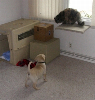 I have attached two pictures...one from when he was probably 9 or 10 weeks old and trying to check out the cat Sophie. At that time he could not reach her there. Now his nose is right on level with the cat's stoop. Wrigley and Sophie are starting to get along. Wrigley is curious and wants to play while Sophie has gotten bolder and now will confront him but when push comes to shove the cat bolts for the basement as Wrigley prefers not to challenge the stairs. I have not encouraged him to do so either so the cat at least has a safe haven for now :) The other picture was taken last week at this time.