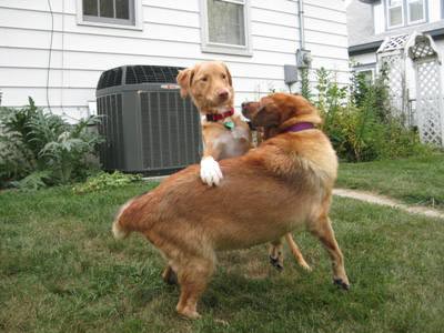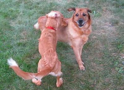 We were a little unsure how Georgia would react to us bringing a 10 month old floppy puppy home to share her space. They met outside on a leash and Georgia gave Nick a vocal bark to tell him as to “Stay out of my face”. We then took them for a walk. On the walk she noticed quickly that he would sniff the same things she sniffed and wanted to chase the same squirrels too. He wasn’t so bad after all.