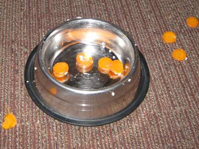 Since we have had Georgia we have been trying to find a "kibble" dog food which she likes enough that she will eat without adding anything. (ie, treats, water, pumpkin, etc) Needless to say all this switching around food made Georgia's stomach a bit upset. She didn’t seem to mind, because an upset stomach meant she got to have “special food”. She loves the special food, usually boiled hamburger and rice, but most recently we tried chicken, rice and carrots. You can see what this critic thought of the carrots, by the pictures.:-) Thankfully we finally found a kibble she loves and actually seems excited to eat!