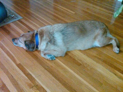We took a picture of her laying all splayed out cooling off on the wooden floor when we got back from our longer walk. She is just so cute. We are really surprised no one has decided they cannot live without this peanut yet.